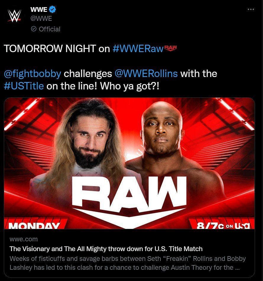 WWE has announced that Rollins and Lashley will face off in a number one contender's match for the United States Championship, but they made a huge mistake when announcing the match on Twitter, writing that the bout will be for the United States Championship itself.