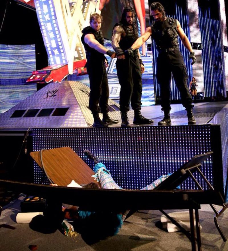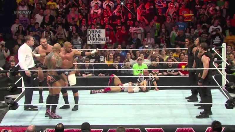 On the May 12th, 2014 edition of Monday Night Raw, Roman Reigns was scheduled to face Batista in the main event. The match ended in a no-contest after Triple H, Randy Orton, Dean Ambrose and Seth Rollins ended up getting involved. The Shield and Evolution continued to brawl until the heel roster came out to attack The Shield once again. The heels took out Seth Rollins and Dean Ambrose but continued to attack Roman Reigns.