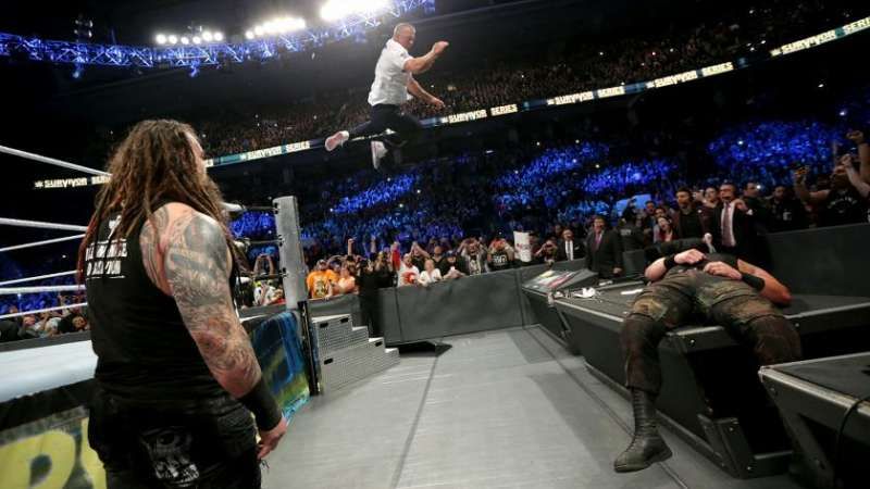 Despite neither team gaining a clear advantage in the first fifteen minutes, the first breakdown came when AJ Styles and Dean Ambrose imploded on each other causing Strowman to take control and eliminate Ambrose.