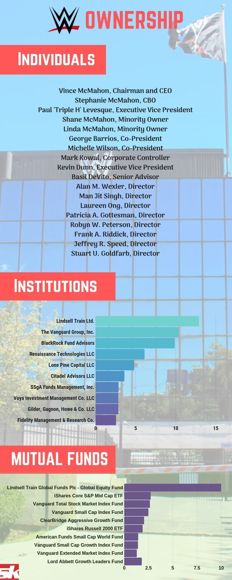 Triple H, Stephanie McMahon, Shane McMahon, and Linda McMahon own tiny portions of the company. Trust us, it’s a massive cake that has been aptly distributed. The following infographic will easily help you grasp the framework of WWE’s ownership: