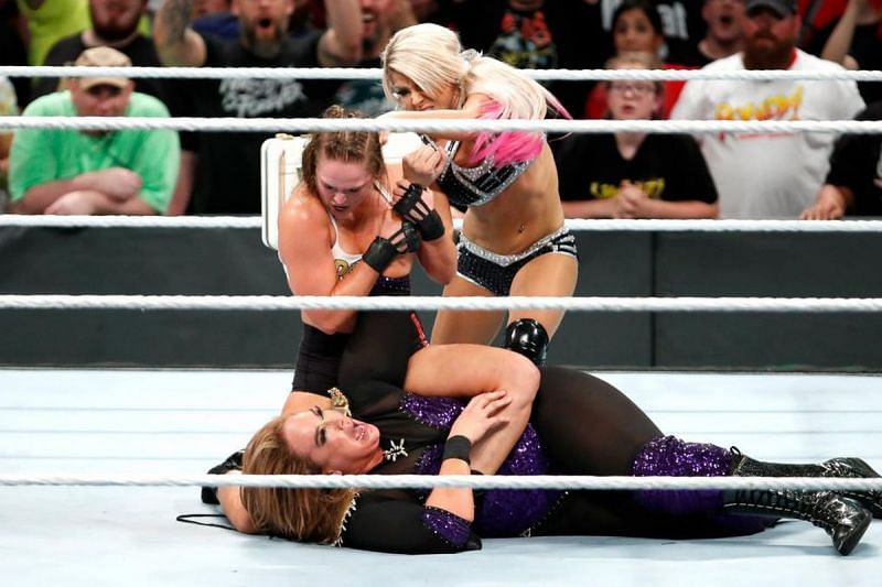 Alex Bliss knocks out Ronda Rousey to disqualify the match, cash in and pin a beaten Nia Jax to become the NEW Raw Women's Champion!