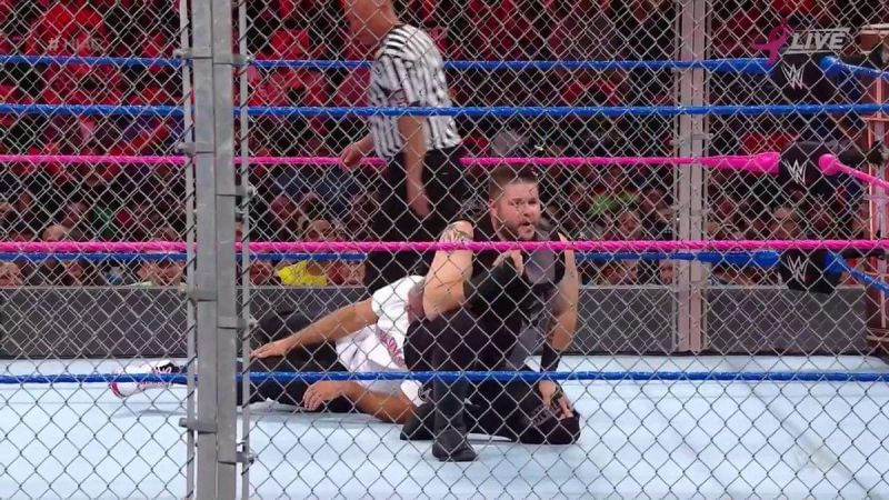 KO escaped to ringside and Shane locked in another armbar. Owens powerbombed Shane into the steel steps to break free. Owens then took out a table and set it up against the cell. He placed Shane against it and went to the apron looking for a canonball. Shane moved and Owens crashed through the table.