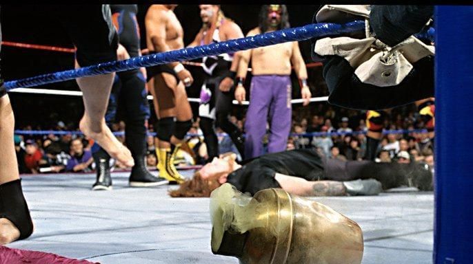 After staying at his side since his debut, Bearer suddenly turned sides and joined the villainous, Mankind. These two had already faced each other in a Boiler Room Brawl in WWE SummerSlam 1996.