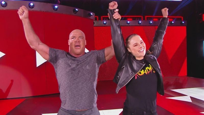 Storyline: Stephanie McMahon slapped Ronda Rousey in the face at Elimination Chamber after the new Raw roster member put Triple H through a table. The following night, Kurt Angle apologised for saying Stephanie and Triple H only signed Ronda because they wanted to “own the b****”, and the show closed with HHH sucker-punching Angle.