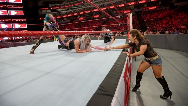 We came back from the commercial break with Bliss being in control of Asuka. As Bliss distracted the referee, Mickie initiated a somewhat botched attack on the Japanese sensation. Asuka attempted to fight her way back into the match, only for Alexa to resume control almost immediately. Then, however, after snapping Alexa off the top rope, Asuka began to build some momentum. A sliding knee gave Asuka a close two count, only for the tables to turn soon after courtesy of another assist from James.