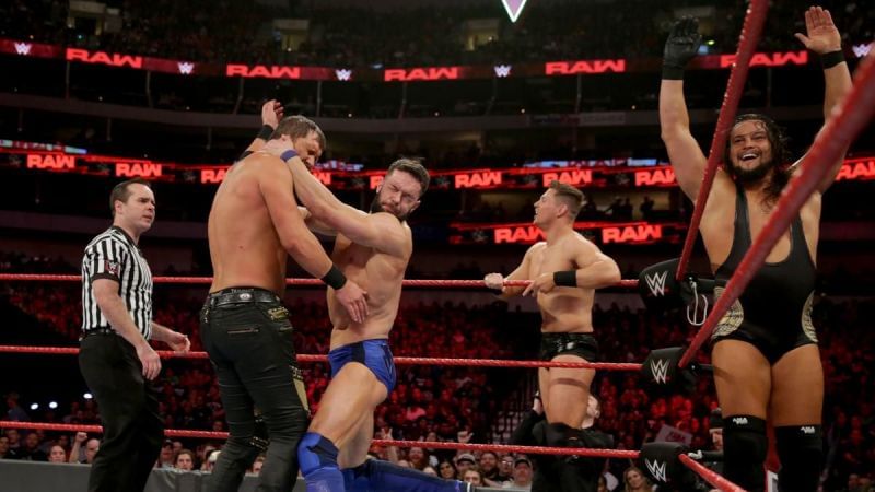 As Cole and Rollins took a stroll down memory lane for Seth's WrestleMania 31 triumph, the Miztourage gained momentum and turned the tide on Balor. Finn tried to fight back but to no avail. The two teams traded blows back and forth, with the leader of the Balor Club making some noise with a leap over the top rope to the Miztourage on the outside.