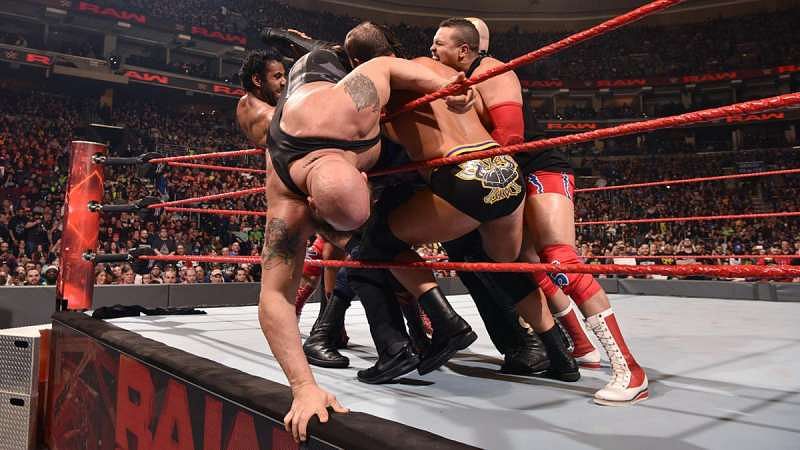 The Big Show came out, followed by Jinder Mahal. Big Show eliminated Jinder Mahal quickly, and then Bo Dallas came out but was thrown out quickly as well. The Shining Stars came out and were eliminated as well.
