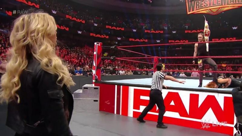 Becky and Charlotte shared some harsh words and Stephanie handed her the documents saying that if she didn't sign them, Stephanie would have to hand Charlotte the title then and there. Becky was signing the document when Ronda Rousey showed up to the arena and walked up to the ring.