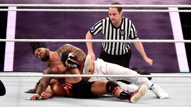 A frog splash by The Usos still saw a nearfall, but a double superkick did.