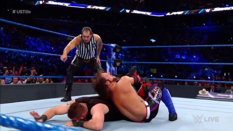 AJ gained control of the bout with a springboard elbow as SD went into a break! Back from Styles was grounded by KO's headlock. Corbin, in the meantime, was doing a fair job as the referee, thought he looked really weird in the black and whites.
