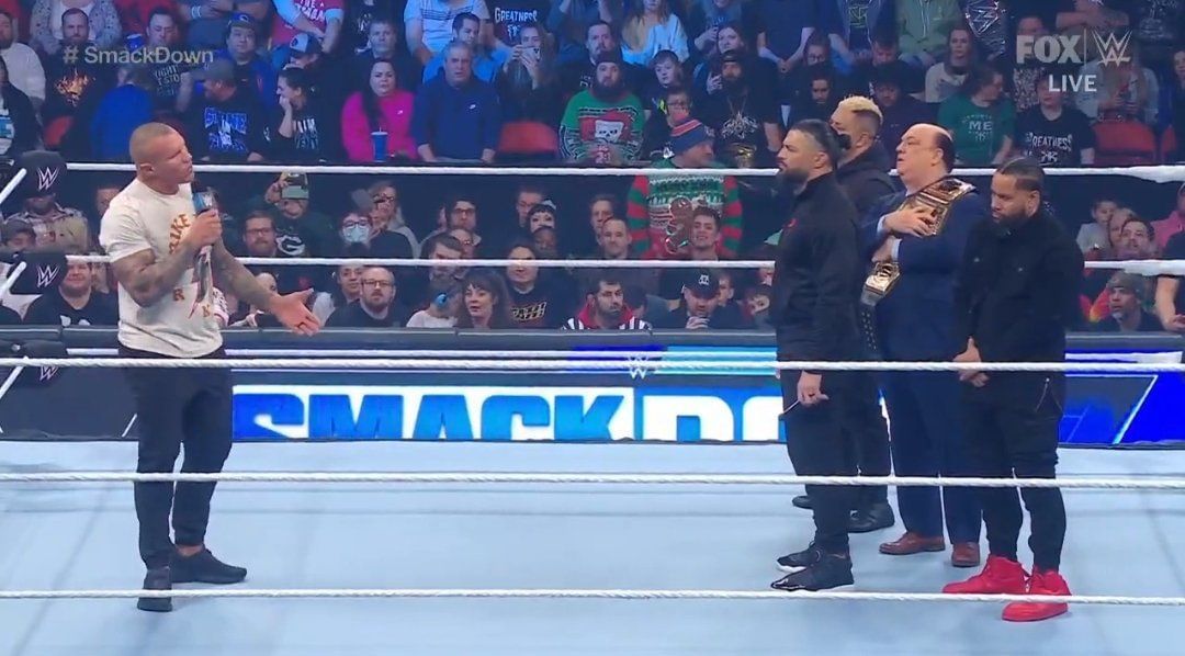 Jimmy Uso looked disappointed that Roman hadn't picked him up before Randy Orton showed up. Orton said he had been waiting 18 months for this moment and challenged Reigns to a title match at Royal Rumble.