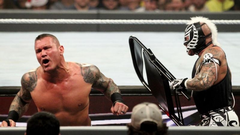 Randy sent Rey onto the announce table with a chair under him and then piled up chairs in the ring. Mysterio hit a hurricanrana and sent Randy into a steel chair in the corner. Rey hit a springboard move but was caught with a chair to the gut by Randy.