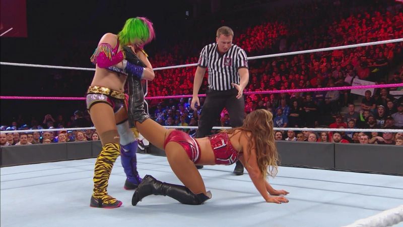 The match started off fast as Asuka immediately tried to lock in a submission move before Emma briefly took down Asuka. She replied with an attempted ankle lock before Emma took control. She dumped Asuka out of the rope before depositing her in the corner.