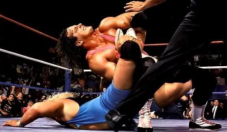 There were some crazy spots in this match, for example, Razor suplexes Shawn over the top to the floor that HBK takes on the knees! Ouch! It’s no surprise that Shawn had serious knee problems when you see a bump like that! They added in psychology with Michaels hurting his knee and Razor working on it very well. Razor was acting heelish in the match so it would make the fans feel more sympathetic towards Shawn and make it seem like a big deal when he eventually won the match.Razor brought another ladder into the match. As Shawn started to climb the ladder, Razor sneaked up behind him and hit him with the Razor’s Edge off the ladder which was yet another cool spot.