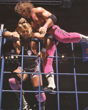 That was crazy and unheard of back in 1994. An emotional Bret talks about that spot in his DVD and how he protected Owen during the fall and how it reminded him too much of how Owen was killed during the Over the Edge pay per view in 1999. In the closing stages, both guys were climbing down the outside of the cage. Watching it again, I noticed that Owen hooked his leg on the inside of the cage to make sure he didn’t fall out first.