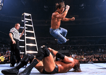 Early in the match Rocky worked on Triple H’s knee and that set up the first part of the match. Hunter kept on fighting back, showing the classic toughness and heart which you’d expect to see from a babyface. They fight on the ladder, Hunter falls off, Rock’s ready to get the title and then Hunter bounces into the ladder, which knocks Rock off. Then a cool spot as Rock did a People’s Elbow while using the Ladder.
