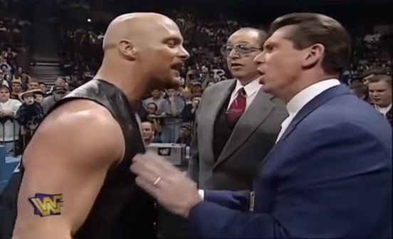 Steve Austin is about to layeth’ the Smackdown on Gorilla Monsoon’s corporate a*s. But Mr. McMahon stops him from doing so.