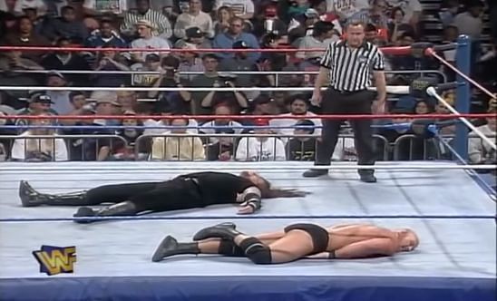 Stone Cold turns the momentum around by using a swinging neck-breaker. Then, Steve Austin does what his character is always supposed to do, that is, stomping a mud-hole on his opponent when the opportunity presents itself.