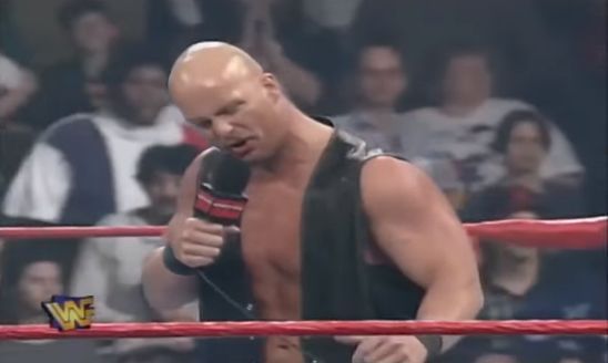 Now, I do not know whether this was scripted or not, but the mic doesn’t work, so one of the ringside crew hands him a new one which prompts Austin to go— “You gonna give me a piece of equipment that works son, or I’m gonna have to whip yo’ ass!”